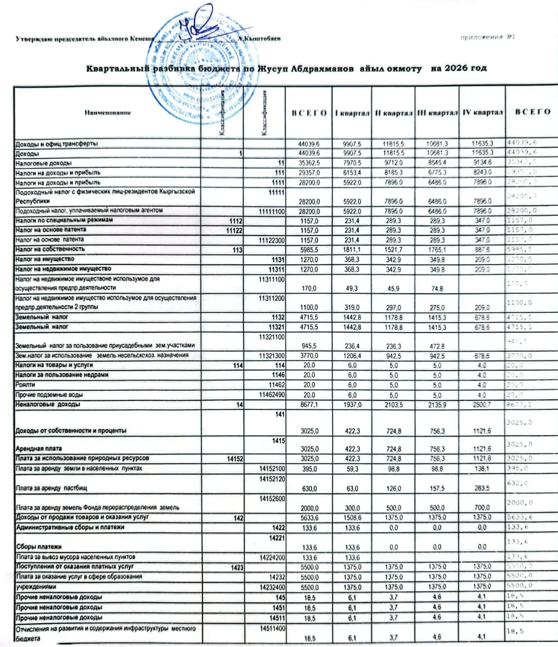 Жусуп Абдрахманов айыл аймагынын айыл өкмөтүнүн 2026-жылга бекитилген жергиликтүү бюджетинин